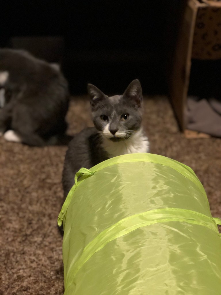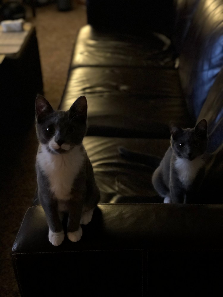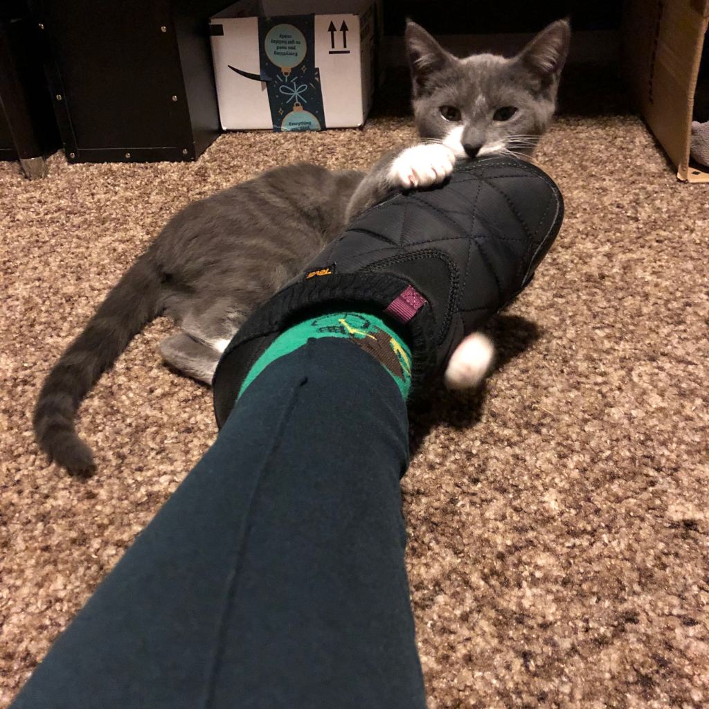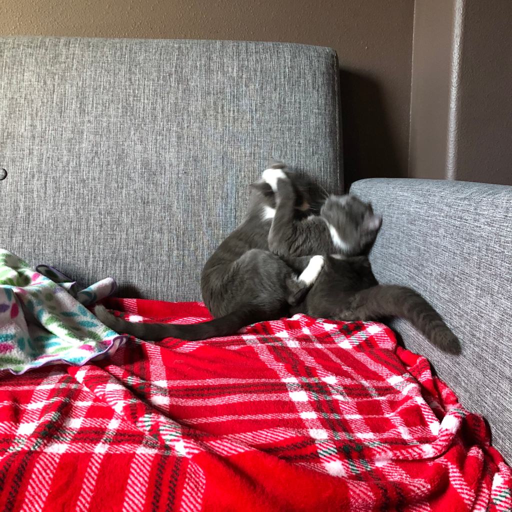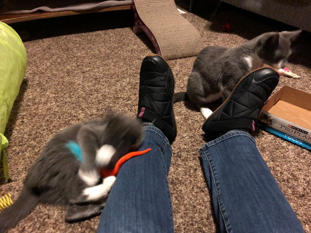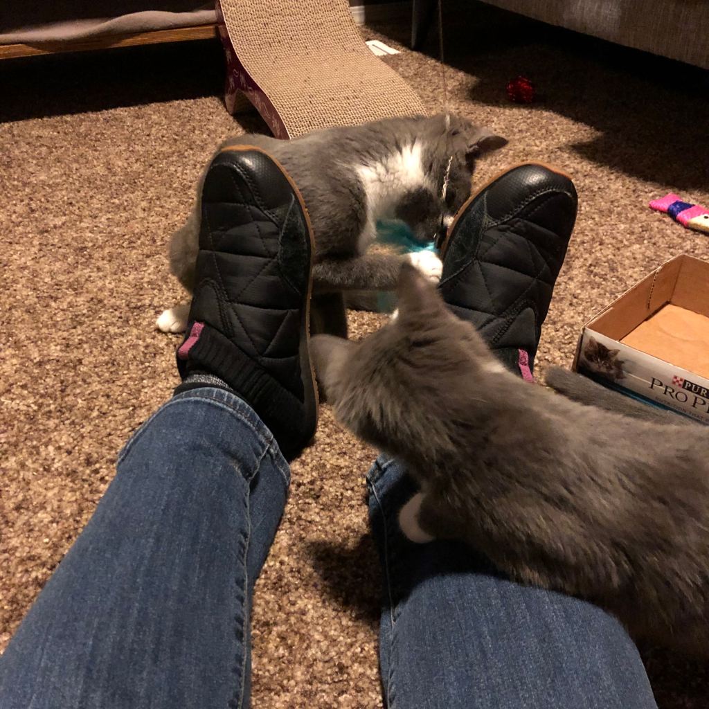Edie sitting pretty, and Maysie getting feisty with my foot. 😼