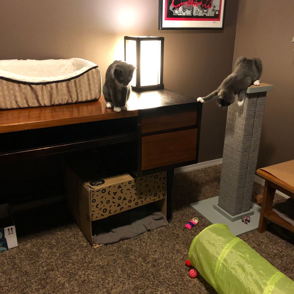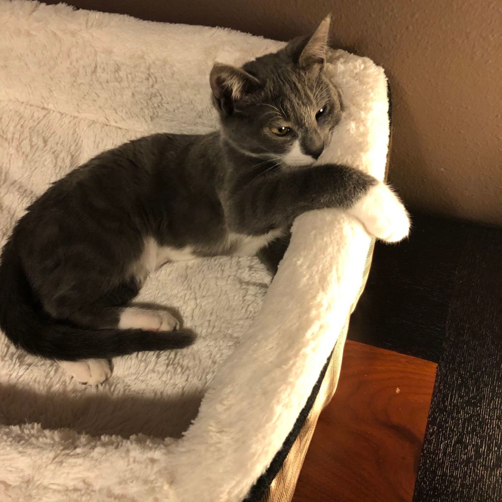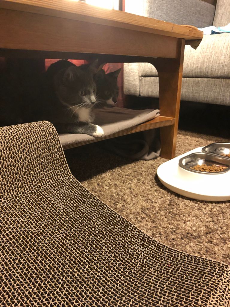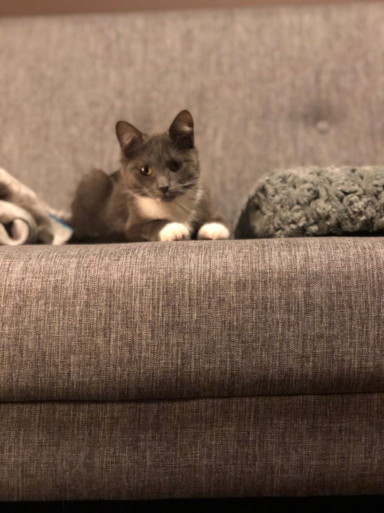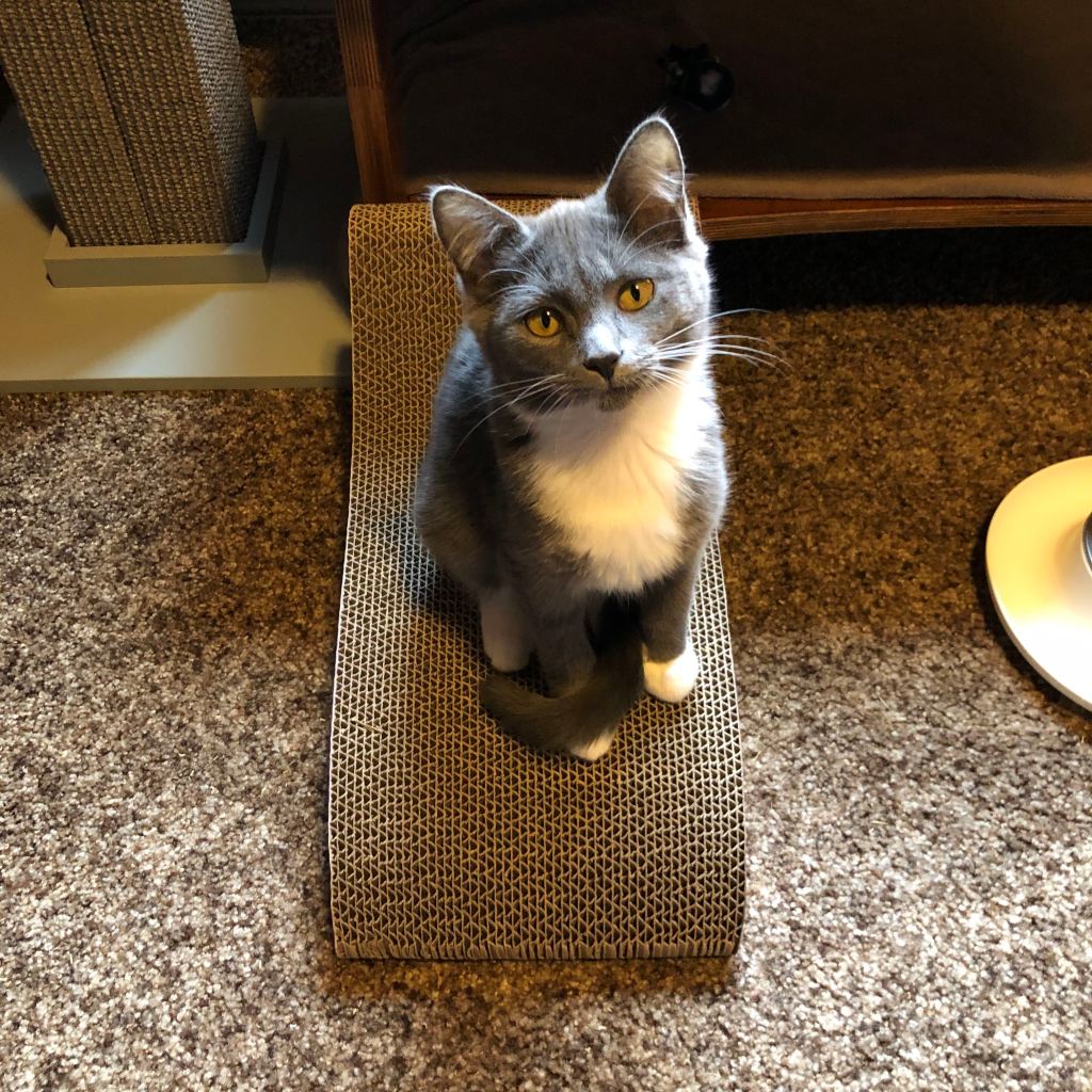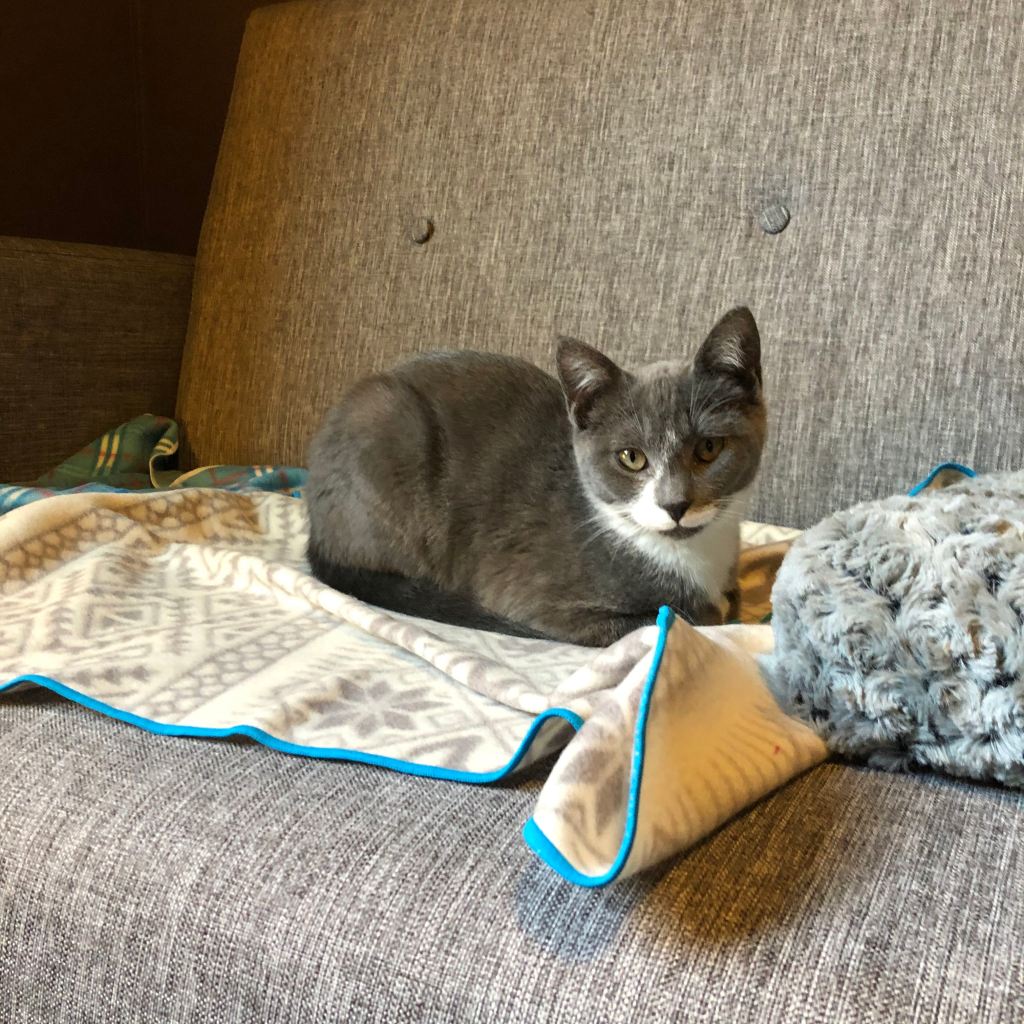 Edie sitting pretty, and Maysie getting feisty with my foot. 😼