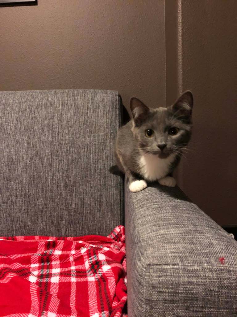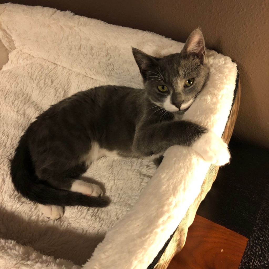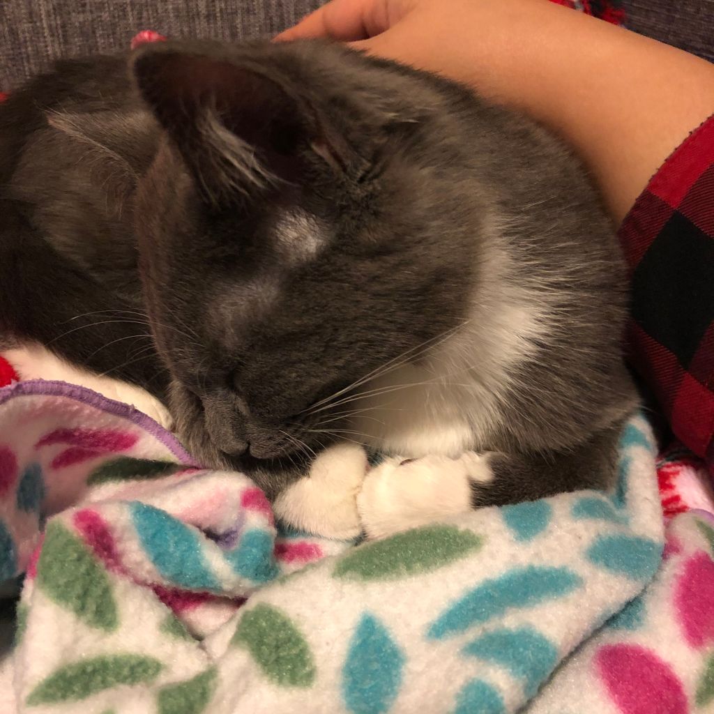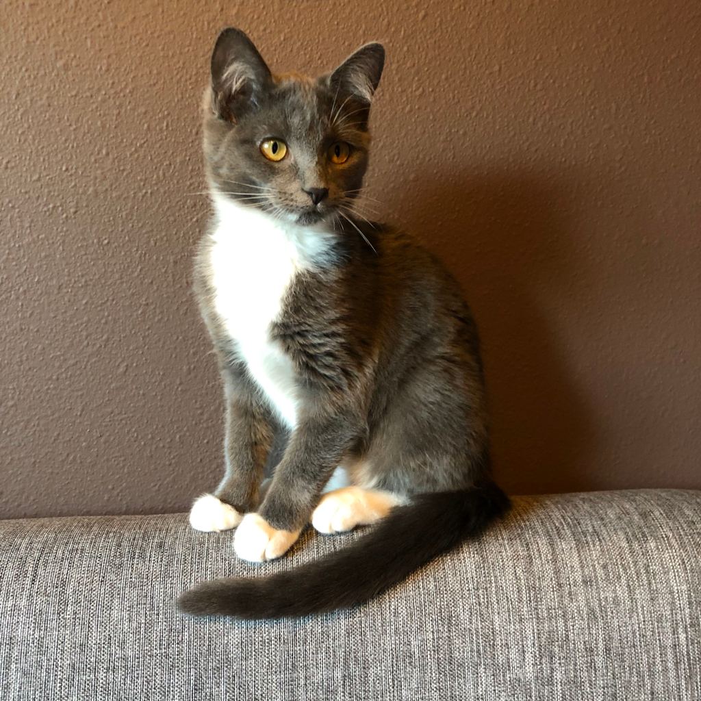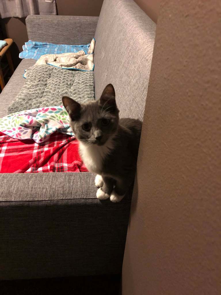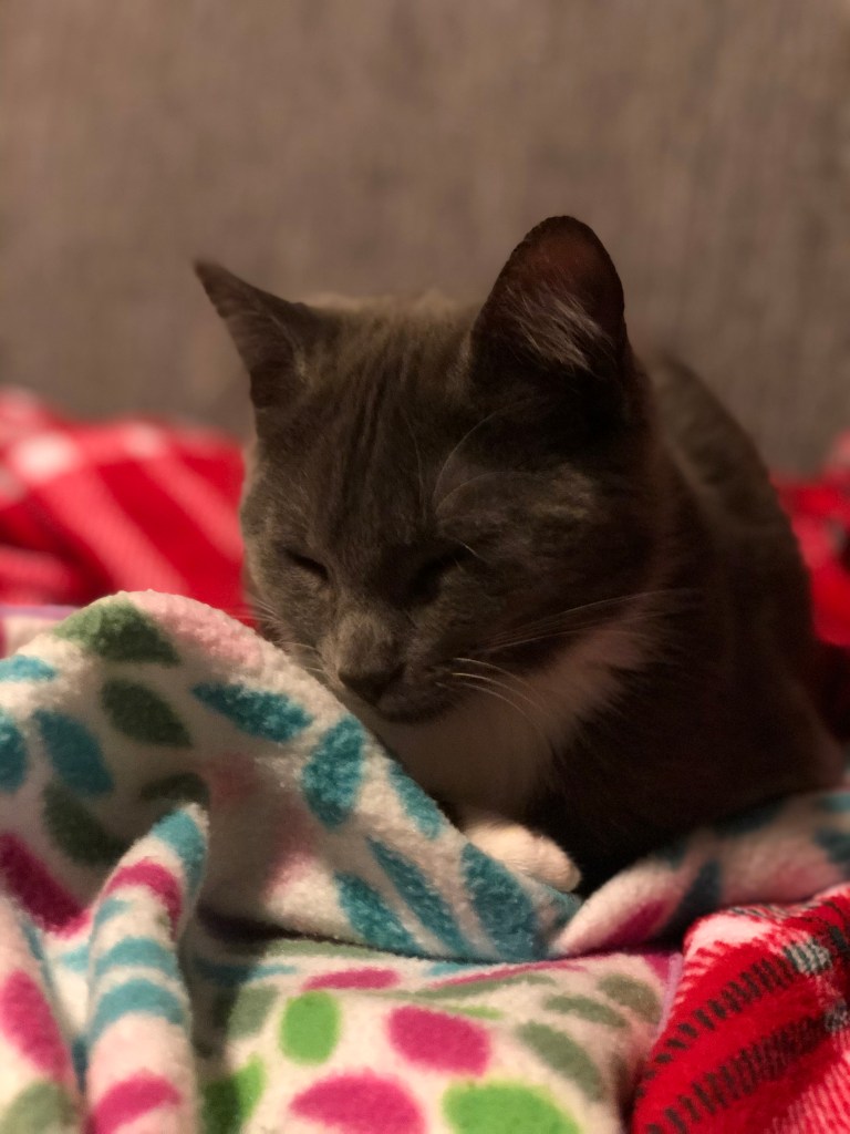Edie sitting pretty, and Maysie getting feisty with my foot. 😼