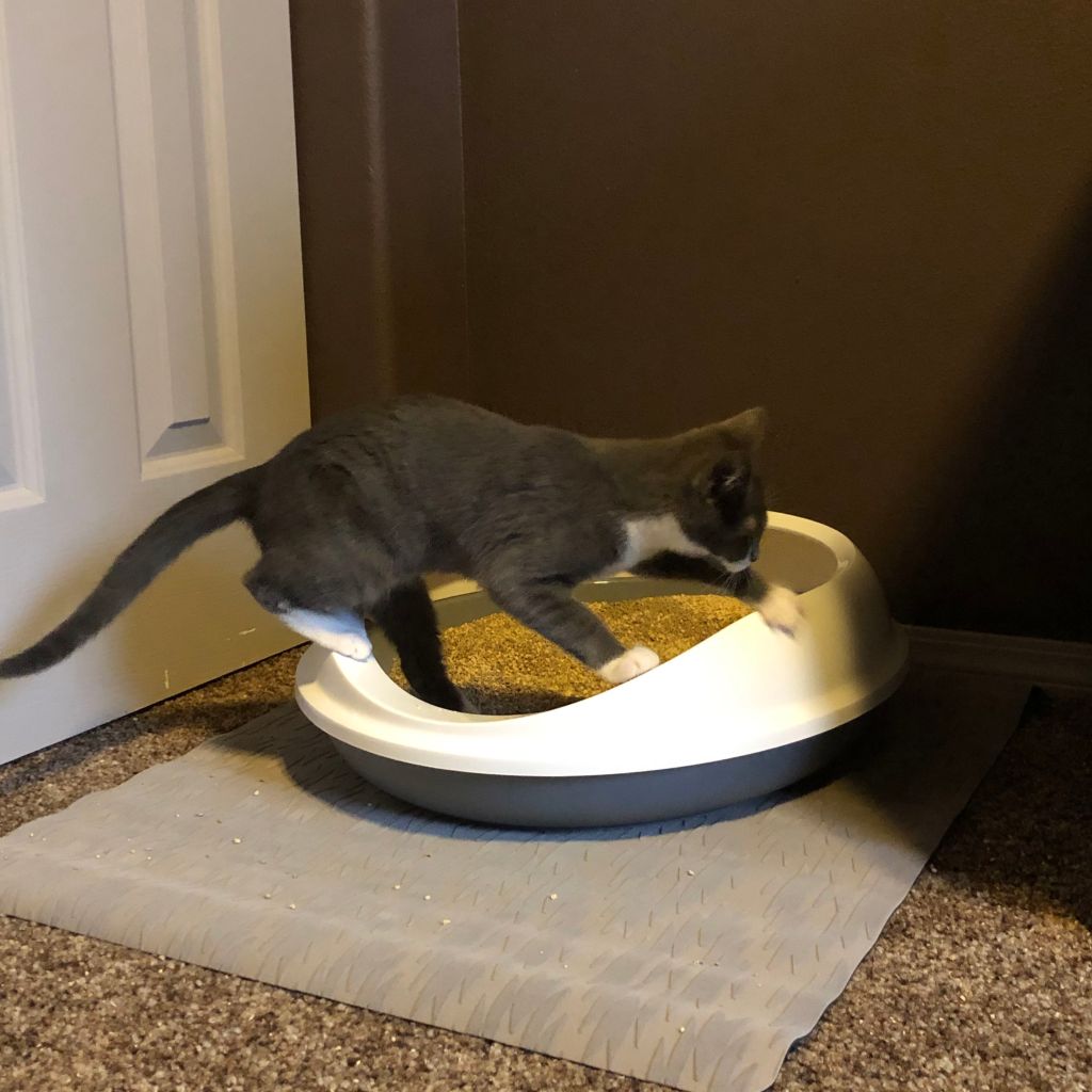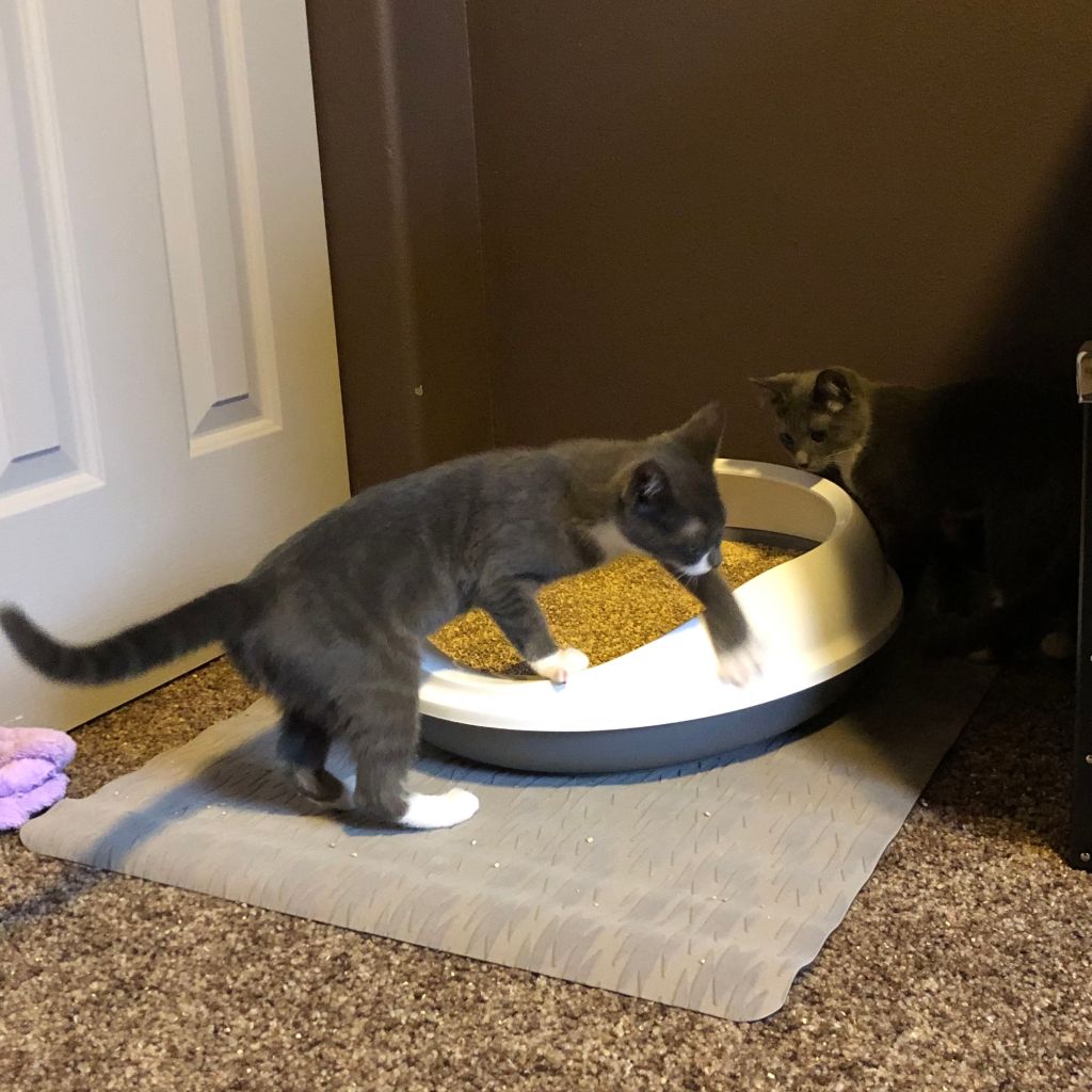 Getting used to their surroundings. Maysie has a funny habit of digging on the side of the litter box. 😹